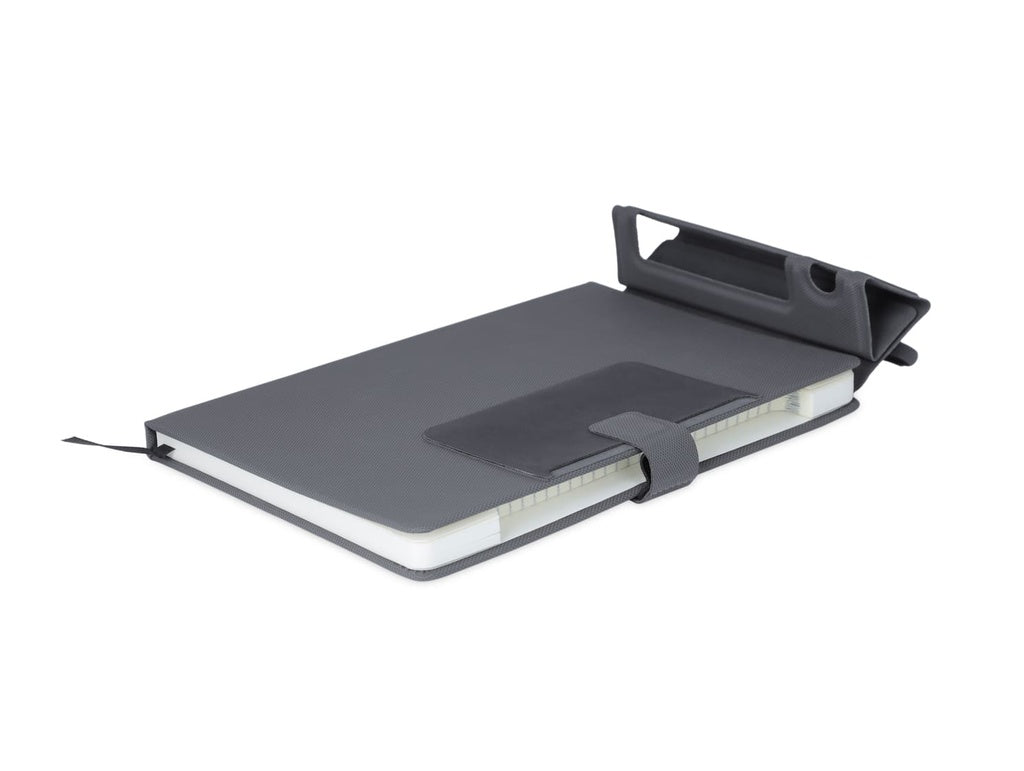 - The notebook contains 192 pages and includes a folding stand for both your phone and a pen.