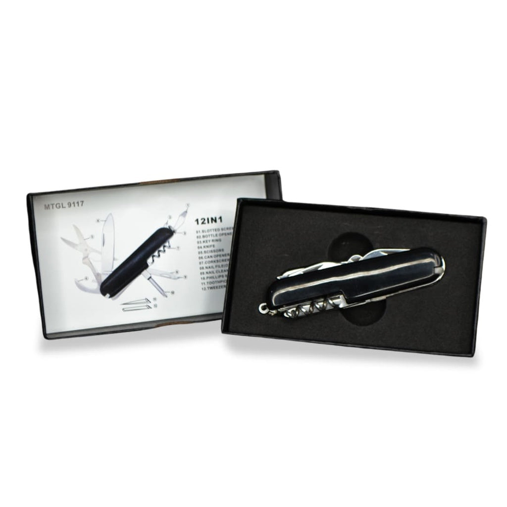 - This compact multitool includes 12 functions: slotted screwdriver, bottle opener, key ring, knife, scissors, can opener, corkscrew, nail file, nail cleaner, Phillips screwdriver, toothpick, and tweezers.